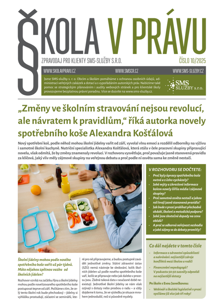Přibližně v polovině každého měsíce školního roku se ve středu ve 14 hodin ředitelé škol či jejich zástupci setkávají na odborném webináři Po škole s Evou Janečkovou. Náplní každého dílu je vždy konkrétní otázka z praxe především mateřských a základních škol, jíž detailně z pohledu školské legislativy analyzuje dlouholetá spolupracovnice SMS-služeb Eva Janečková. Stálí posluchači vědí, že nechybí ani praktické příklady. Klienti, pro něž je tento webinář součástí služby pověřence pro ochranu osobních údajů, i zájemci z řad veřejnosti mají navíc po vysílání k dispozici záznam, který je dostupný v klientské sekci webových stránek SMS-služeb. Pustit ze záznamu si tak lze i starší díly, a to i ty, které jsme vysílali v právě skončeném školním roce nebo v tom předcházejícím. To nejdůležitější nebo nejzajímavější z obsahu každého vysílání pak nabízíme také ve zpravodaji Škola v právu ve stejnojmenné rubrice Po škole s Evou Janečkovou, kde reflektujeme vysílání konkrétního měsíce.